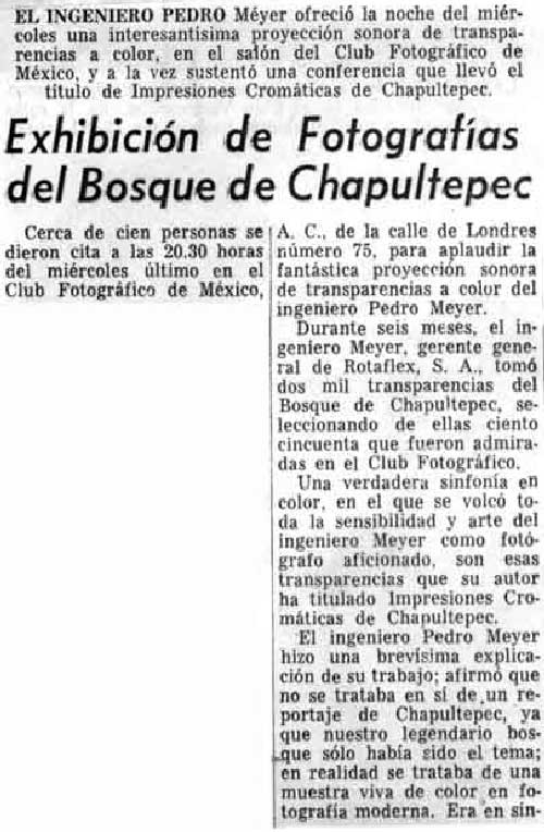- Se presenta el audiovisual de Chapultepec por la casa Leitz en el International Photographic Fair de Nueva York; recibe la primer recompensa económica por un trabajo fotográfico personal (Cámara réflex con todos sus lentes).